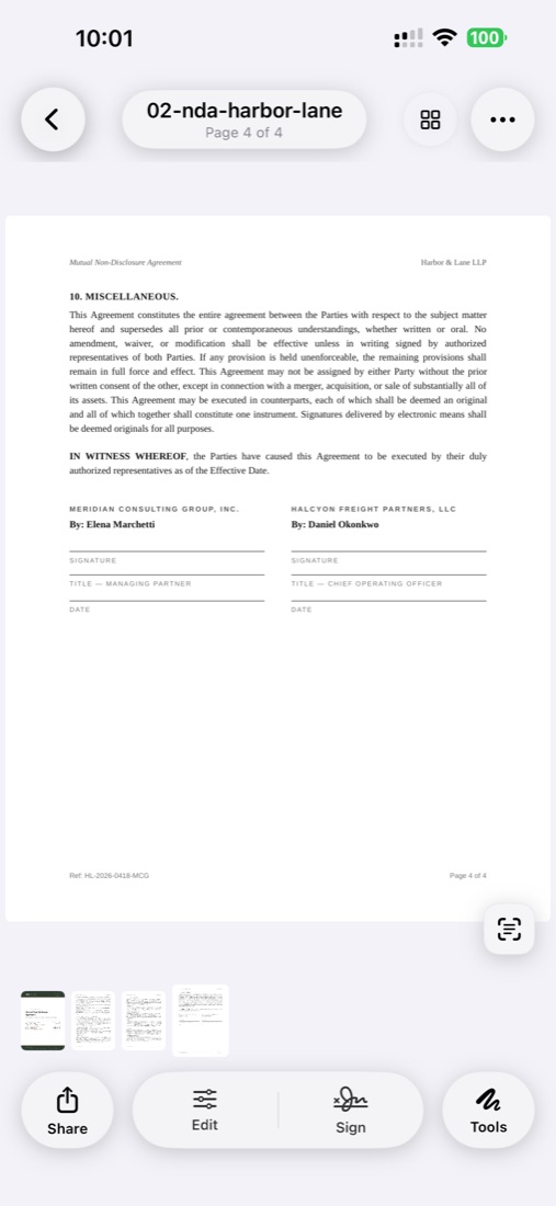 Open a PDF from email, Files, or cloud storage, add your signature, initials, and date, then send the signed file back from your iPhone.