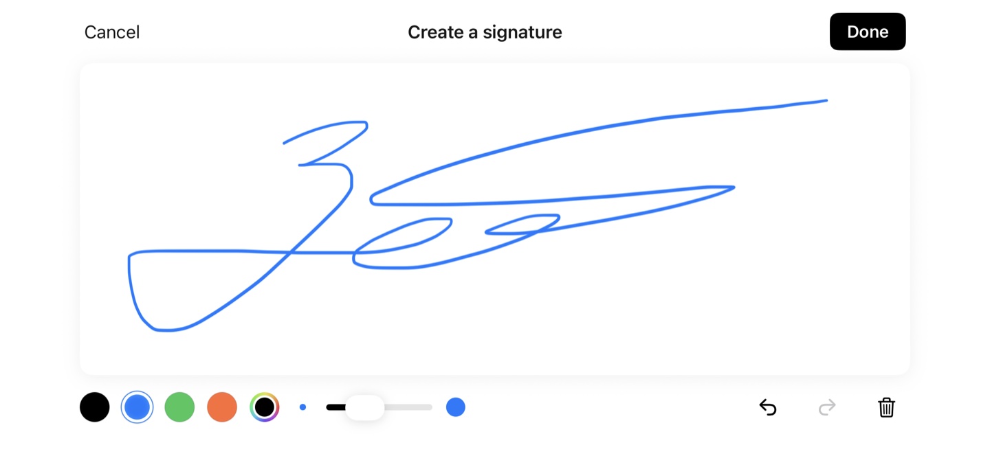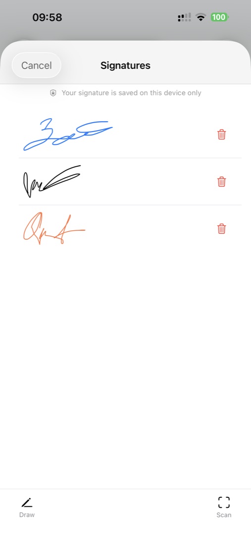 Saved signatures stay on your iPhone and are protected by your device security settings. They are only shared when you export or send a signed PDF.