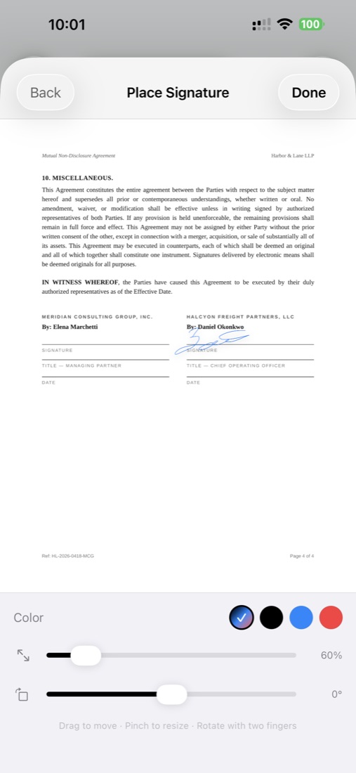 Place your signature on the signature line. Pinch to resize and drag to position exactly where needed. The signature maintains quality at any size.